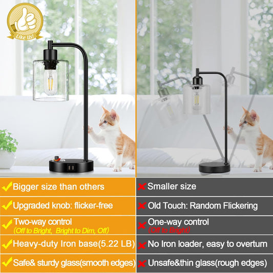 Set of 2 Industrial Table Lamps with 2 USB Port, Fully Stepless Dimmable Bedside Lamps for bedrooms, Nightstand Desk Lamps with Seeded Glass Shade for Reading Living Room Office 2 LED Bulb Included