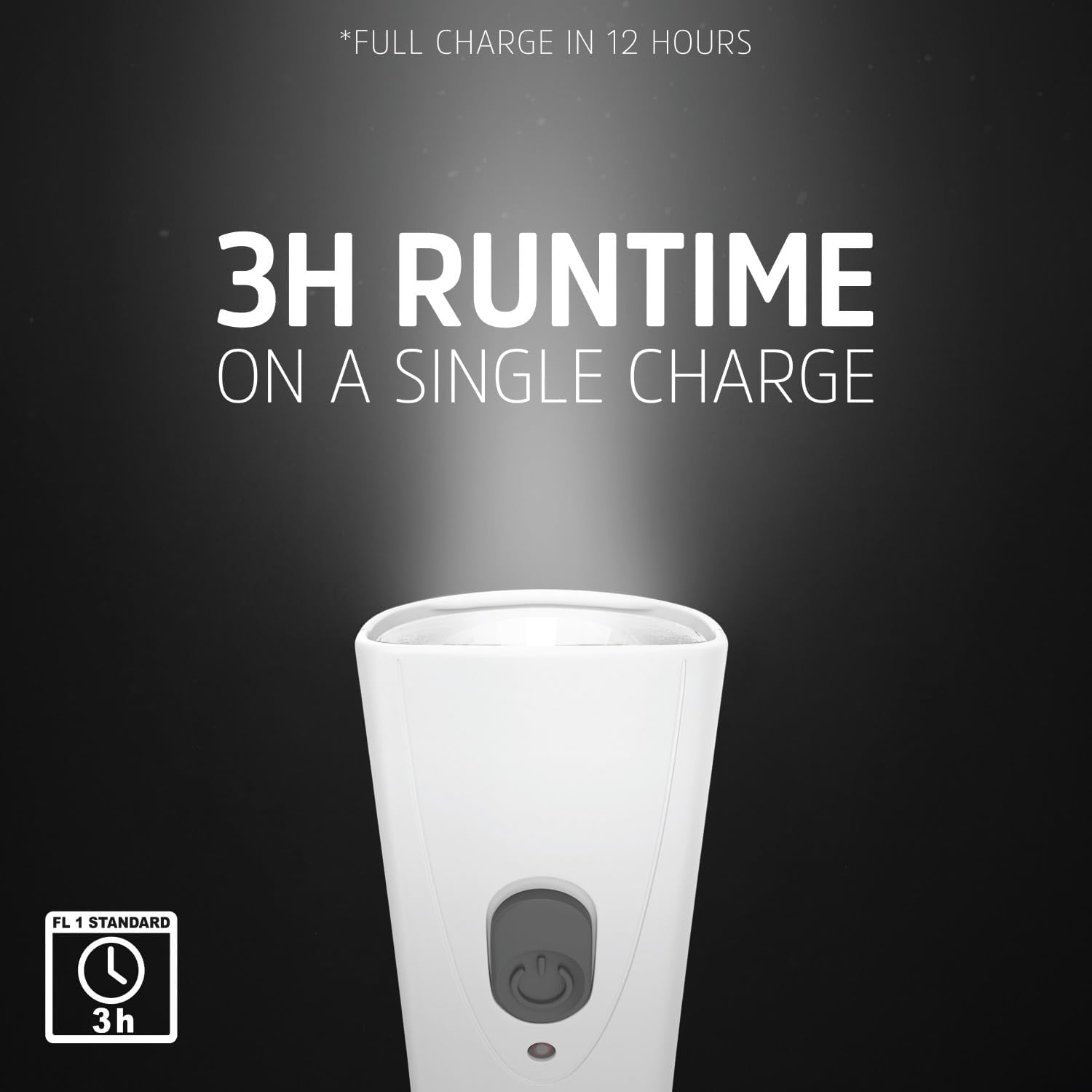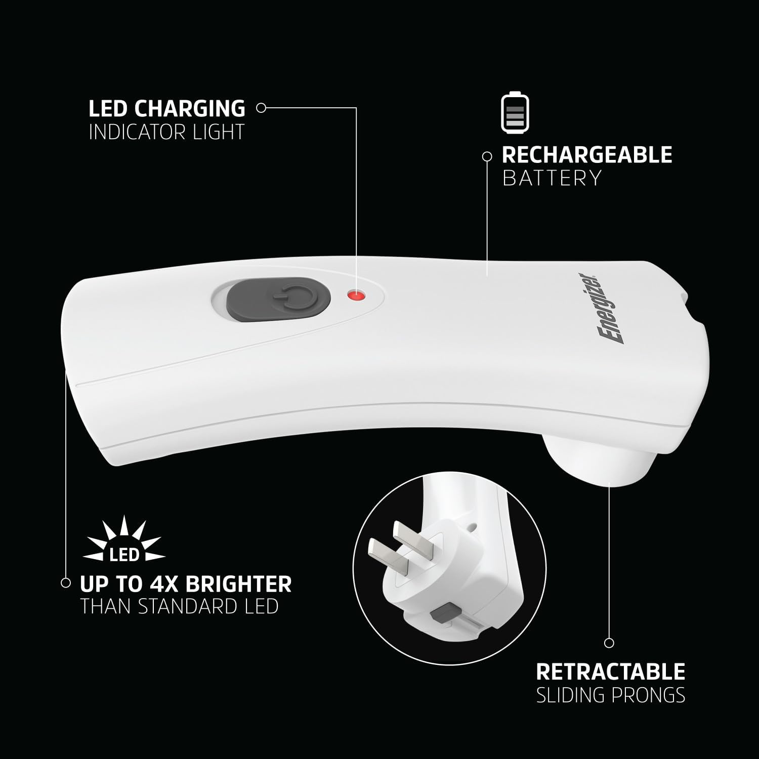 Stay prepared for power outages with the Weatheready Rechargeable Compact Handheld Light. This 3-pack of Energizer emergency lights ensures you're ready when the lights go out. Each rechargeable LED flashlight plugs into standard outlets, providing a convenient source of light when needed. Automatically turning on during power failures, these lights offer up to 4 times brighter illumination than standard LEDs, lighting up objects up to 30 meters away. Durable and impact-resistant up to 1 meter, these compact flashlights are easy to use and charge with retractable prongs. Equipped with a built-in lithium battery, each light provides 40 lumens of brightness and a runtime of up to 3 hours. Perfect for emergency situations, power outages, and hurricane supplies, these rechargeable LED lights offer reliable, convenient lighting solutions.